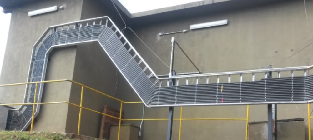 Escaleras de 300x75 mm en chapa calibre 18, con soporte colgante que permite la fijación de la línea de aire comprimido.